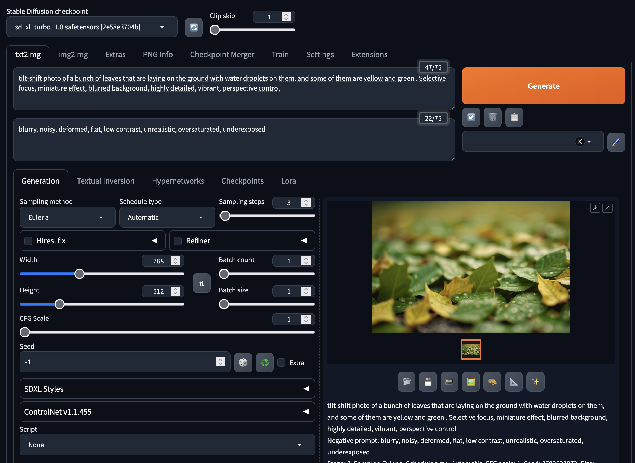 sd_xl_turbo_1.0qui est plus performant avec une taille de 1024px par 1024px (mais plus lent). Il est aussi possible de générer une image plus petite puis d'utiliser l'upscaler intégré pour augmenter sa taille. - Steps : les steps correspondent au nombre d'étapes ou de passage du processus de génération. Le modèle SDXL accepte entre 1 et 3 steps seulement. En général les modèles tournent autour de 20-25 steps.